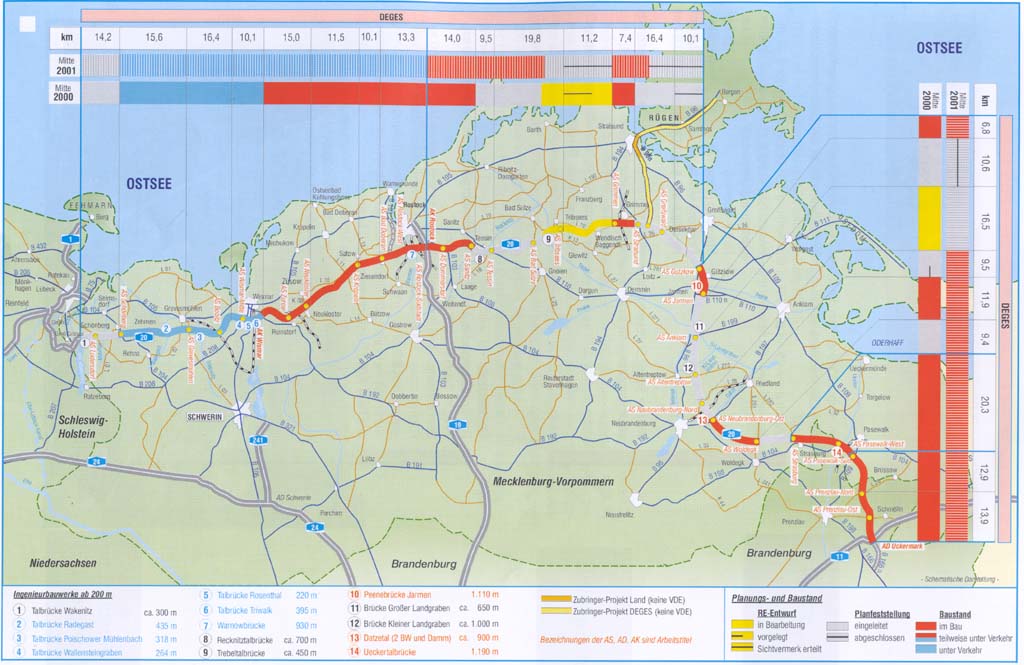 · Im Herbst 2000 werden die letzten zwei von 24 Planfeststellungsverfahren für die A 20 eingeleitet, so daß in 2001 das Baurecht für das Gesamtprojekt vorliegt.