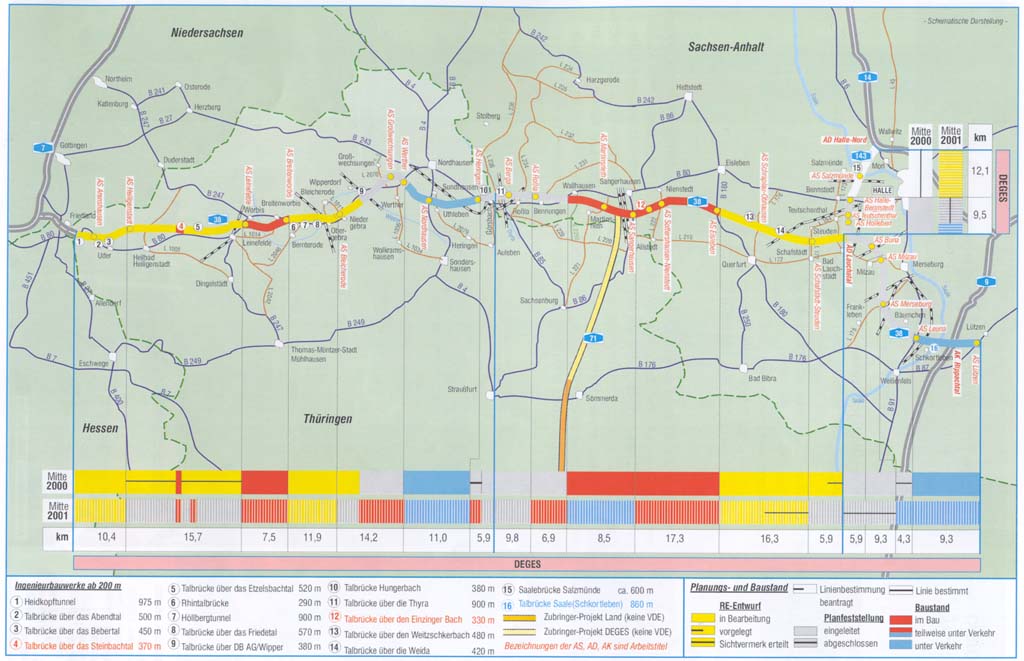 · Im IV. Quartal 2000 beginnt der Bau der beiden Großbrücken Etzelsbachtalbrücke (520 m) und Talbrücke Rodegraben (200 m) in Thüringen.