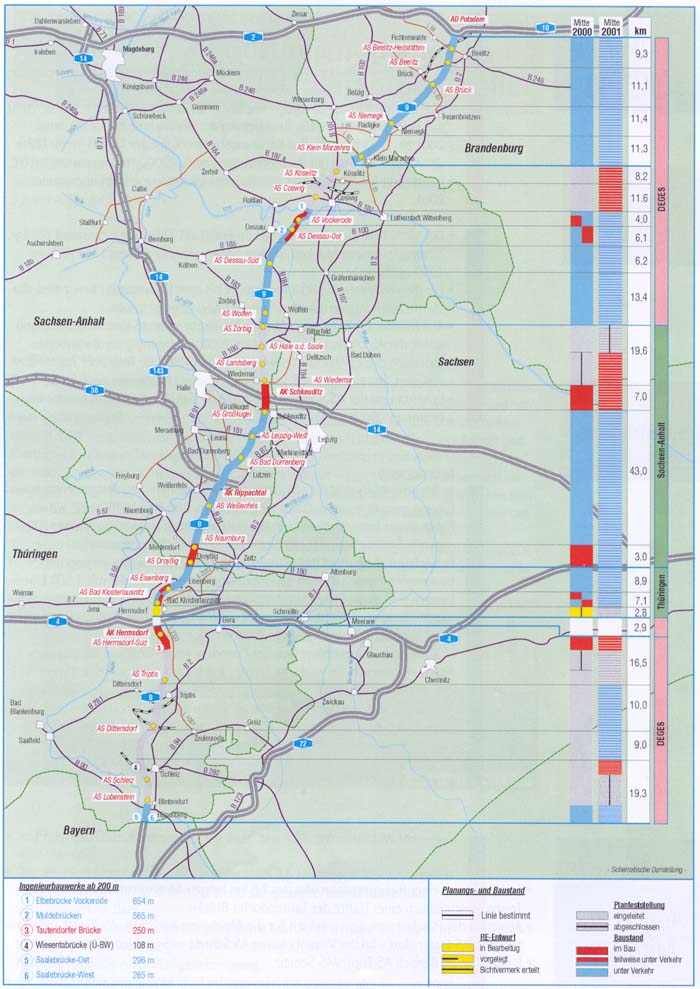 · In Sachsen-Anhalt wurde das nördlich an die Muldebrücke anschließende 6,9 km lange Teilstück im September 2000 fertiggestellt.