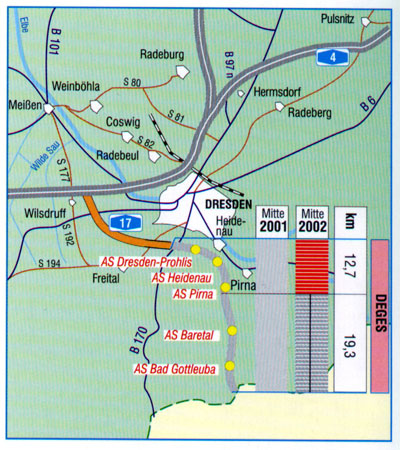 und Pirna (13 km) sowie für die knapp 6 km langen Zubringer Prohlis und Heidenau