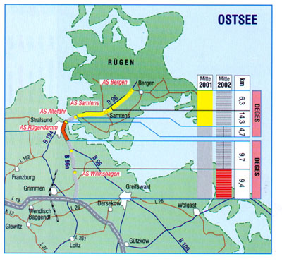 · Für den Abschnitt Altefähr bis Bergen sind die Planungsaufträge vergeben, damit spätestens in 2003 mit den Brücken- und Streckenbauarbeiten begonnen werden kann, um ebenfalls 2005 diesen Abschnitt für den Verkehr freizugeben.
