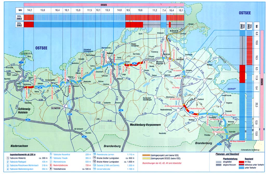 Ebenfalls in 2003 werden die Bauarbeiten in den Abschnitten zwischen der AS Jarmen und der AS Neubrandenburg-Nord (27,1 km) beginnen.