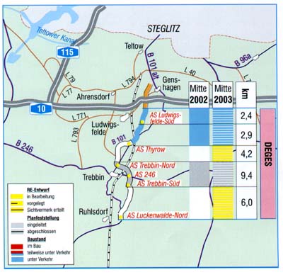 · Der Abschnitt zwischen der AS Ludwigsfelde-Ost (A 10/B 101 n) und der AS Thyrow (5,3 km) wurde am 26. August 2002 vollständig fertiggestellt.