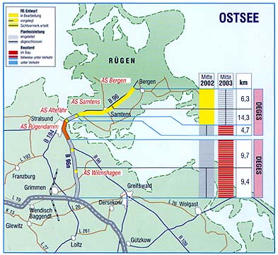 · Für die Abschnitte auf der Insel Rügen zwischen AS Bergen und AS Altefähr (20,6 km) sind die RE-Entwürfe fertiggestellt. Die Planfeststellungsverfahren werden im IV. Quartal 2002 eingeleitet.
