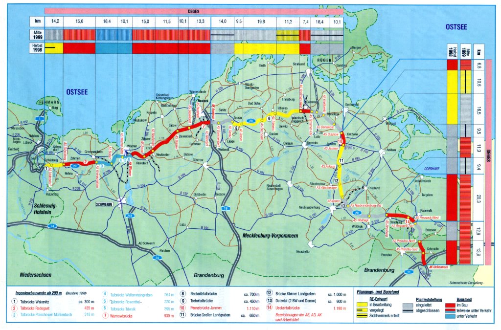 In Bau befindet sich sowohl der westlich an den im Dezember 1997 unter Verkehr genommenen Abschnitt Grevesmühlen - Wismar anschließende Abschnitt zwischen Schönberg und Grevesmühlen (15,6 km) als auch die östlich anschließenden Abschnitte bis zum Autobahnkreuz Rostock (51 km). Herausragendes Bauwerk ist die Warnowbrücke südlich Rostock mit 930 m Länge - Baubeginn: August 1997. Nach dem vorliegenden Zeitplan wird der gesamte 93 km lange Streckenabschnitt zwischen Schönberg und dem AK Rostock bis Ende 2000 durchgehend befahrbar sein.